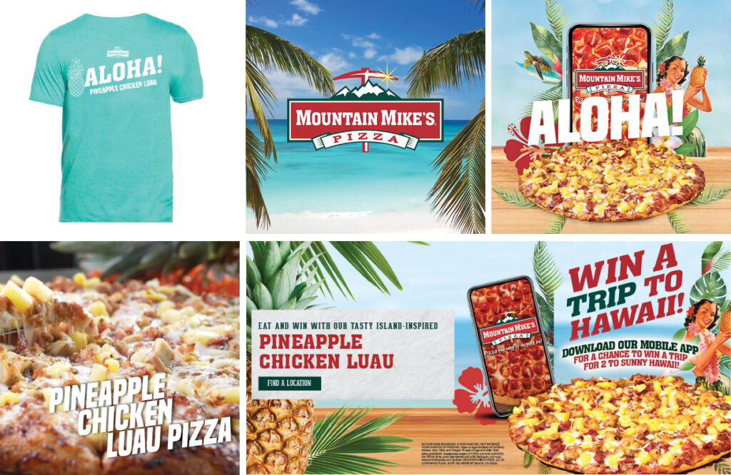 Developing an enticing LTO (limited time offer) or a new menu item is easy. But the real challenge is to truly break through and make people pay attention to your brand. When Mountain Mike’s Pizza wanted to establish a comprehensive campaign surrounding their Pineapple Chicken Luau Pizza, Blue C’s expertise was requested. This campaign spread across all vital channels – in-store POP, social media, employee promotional apparel, online (website and ads), email campaigns, mobile marketing, new photography assets, and CTV commercials.